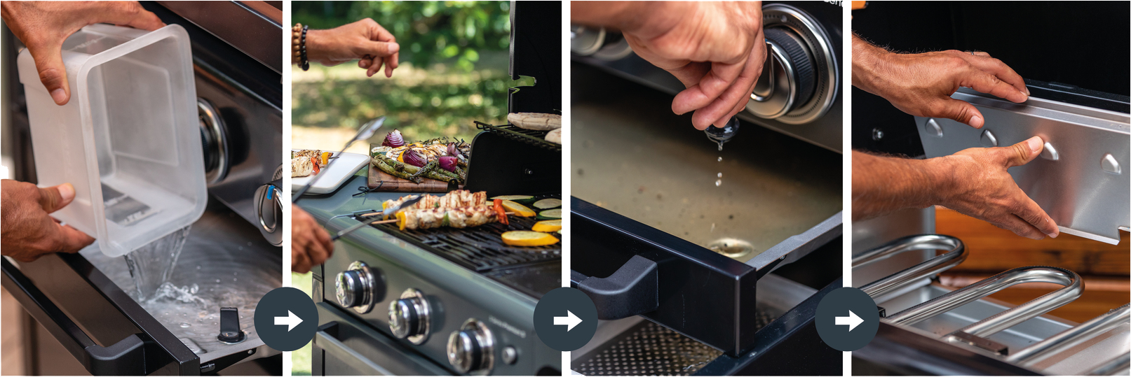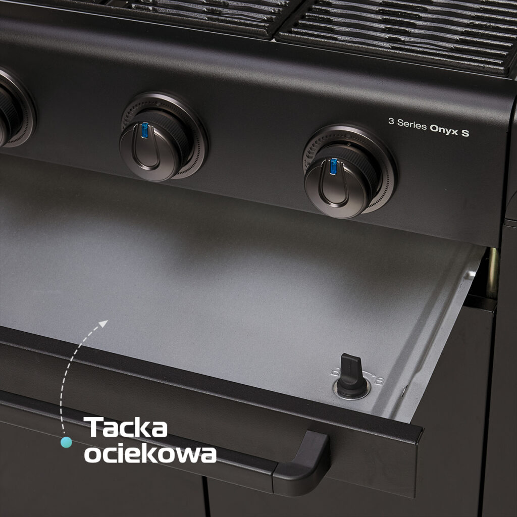 Wlej wodę do tacy ociekowej, w której będzie zbierał się tłuszcz i reszki jedzenia. Po grillowaniu wyjmij korek i zlej wszystko do zamontowanego pod spodem pojemnika, który oddzieli płyn od resztek. Wyciągnij pozostałe elementy i włóż do zmywarki.